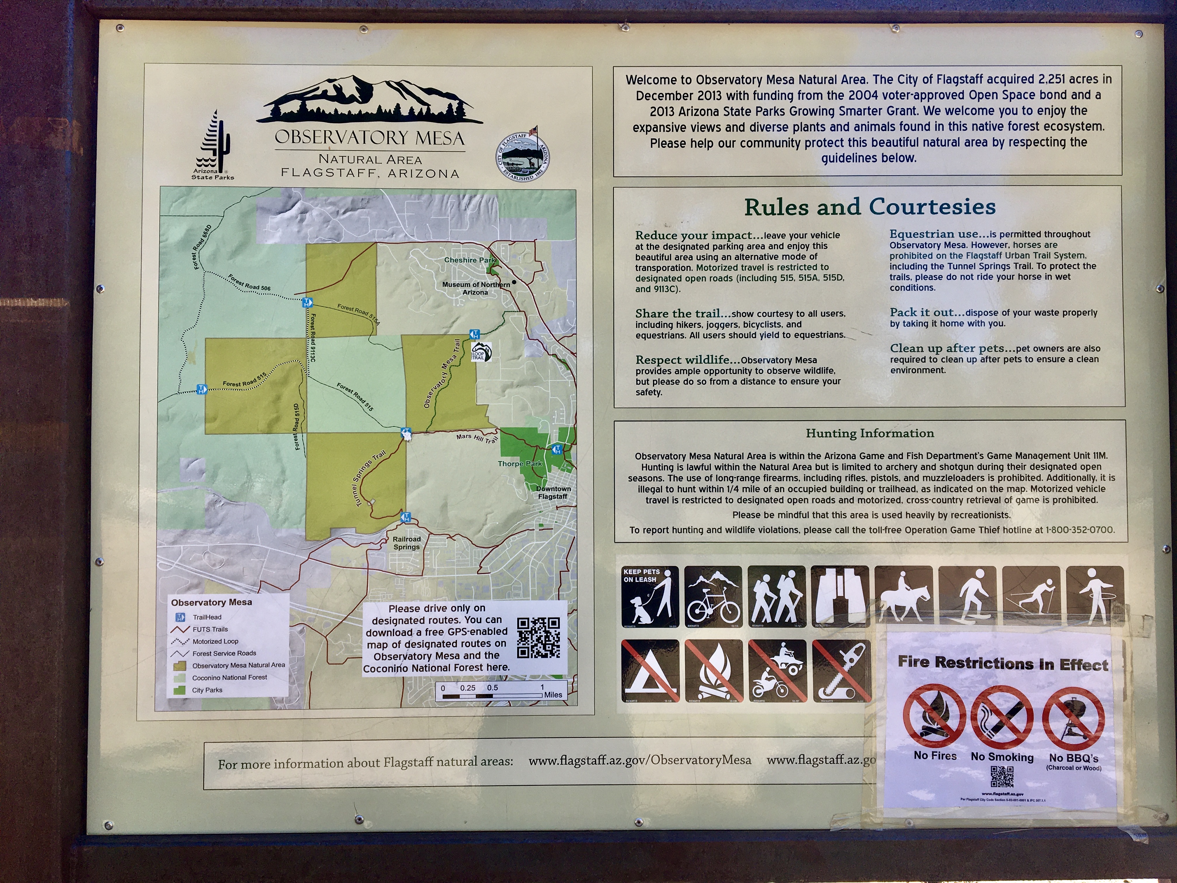 The Tunnel Springs trailhead is right next to a small neighborhood on the east side of Flagstaff. It’s known for walking and biking and first makes it’s way under the railroad tracks and then up the side of the Observatory Mesa. The trail is maintained very well and is not too heavily trafficked by walkers and bikers. Once up in elevation a bit you’re able to look out over a forested area of Flagstaff. The trail itself is 2 miles and dead ends at an intersection where you can continue for another 10 miles or so to do a large loop or end on different sides of the mesa. The whole area is covered in trails designated as part of the Flagstaff Urban Trail System (FUTS) and Observatory Mesa Natural Area.