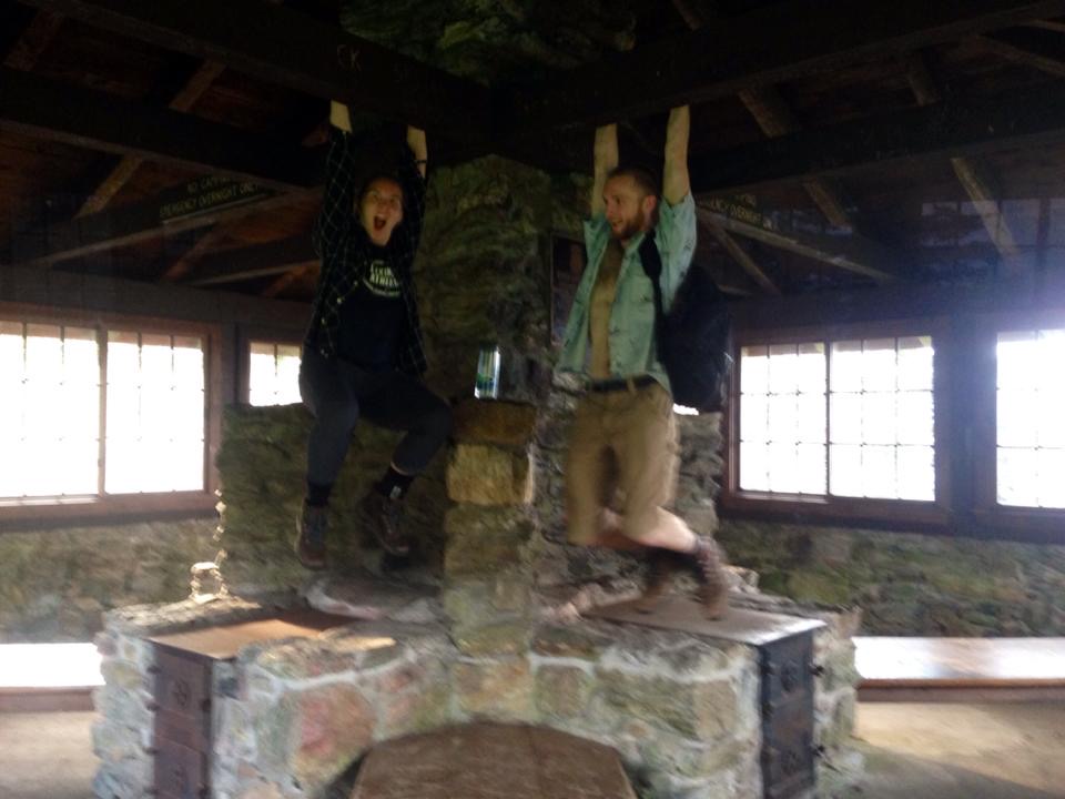 After claiming a campsite and setting up our tents we headed off on our hike to the summit. On our way up we came across this little shack in the photo above. We didn’t go over to it and I’m still not entirely sure what it’s used for. We continued our hike and at one point popped out on to the road up the mountain before going back in to the woods on the trail up to the top. It’s still strange coming across a road on a hike, especially if it’s paved. Once we reached the top we explored all over. We hung out a bit in the Bascorn Lodge, as you can see by the photo below.