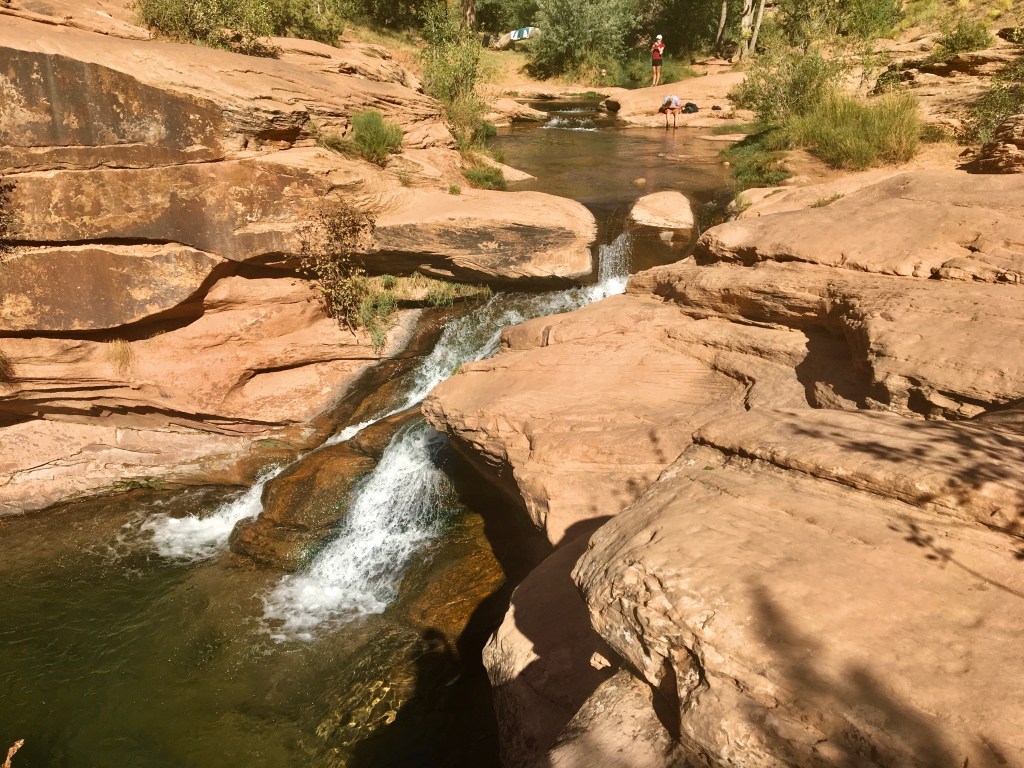 For the day, we decided to try doing the rocky drive down the Potash Rd. to Canyonlands National Park in the Crosstrek. The man in the RV couple had said that we could easily do it. The road was definitely drivable in the Crosstrek…at a very slow pace. It took us several hours to get to the sign saying you’ve entered in to the National Park, and that was only at 5 miles of the 18 miles until the main road in to the park. We thought long and hard about whether to continue or to head back and rent a Jeep for the next day to have a more enjoyable, less lengthy, off-road drive into the park. We decided renting a Jeep would be the wiser option, so we headed back into town and went to Jenn’s Jeeps Rentals- most affordable in Moab- to inquire about a rental. They were off to lunch so we left to go explore and then come back later. Because it felt so hot- even though it was only 75 degrees- we went in search of some water to splash around in.