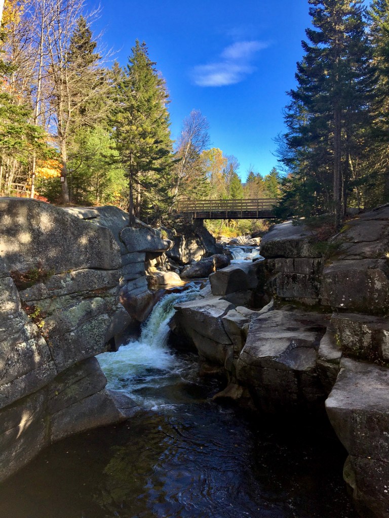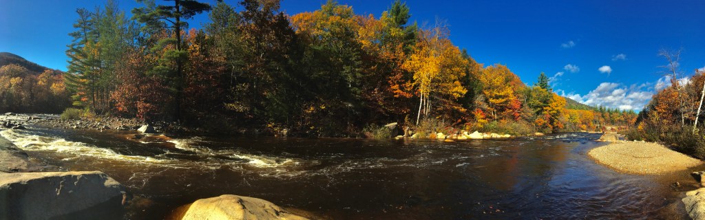 Later in the day my parents arrived, and my mother and I stayed up late watching a movie and bonding with conversation while polishing off almost 2 bottles of wine- most I’ve drank in a LONG time. The following day, with a bit of a hang over, my parents and I in the afternoon went for a walk up the Pemigewasset river and did a bit of sightseeing along the Kanc. We first went down to the river to check the levels and then walked from the Hancock Campground over to the Wilderness trail that then leads to the right over a wire bridge and back over the car bridge on the Kanc and then back to Hancock Campground. It’s a really nice and easy walk that shows you river, bridges, leaves, and mountains.
