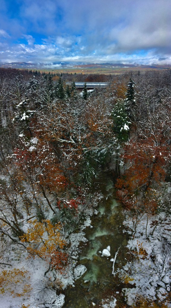 We first stopped at The Basin and checked out the river flow and did a quick walk up to the Kinsman Falls. We then made our way up and over to go down 302 through Crawford Notch, but not with out first stopping at the Governor Gallen Memorial Bridge that crosses the Lafayette Brook and looks out over the town of Franconia. The parking lot was COVERED in snow, and so was Cannon mountain a little ways back. I have to say, in my opinion, there aren’t many more beautiful things than colorful fall foliage covered in snow and a river passing underneath with mountains and hills in the background.
