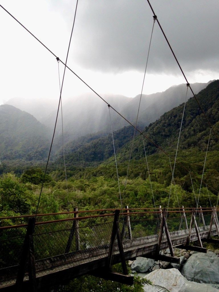The next day we spent the morning hiking up to the Fox Glacier. You can’t hike as close to the glacier due to how steeply eroded the river bed is and so the only way to be close to it is by dropping down on to it by helicopter…this was not in our budget. We enjoyed the glacier from afar and enjoyed a wire bridge farther down the river bed.